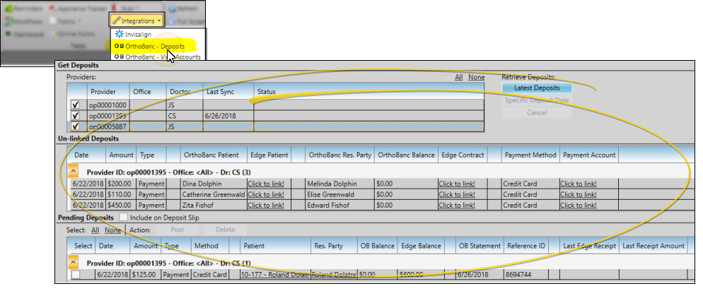 Use the Edge Cloud / OrthoBanc integration to retrieve deposits that OrthoBanc has collected from your patients, and post them to the correct contract and payment account. You can also use this feature to resolve unlinked accounts and view pending deposits.