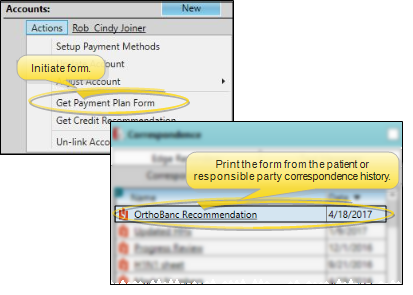Use the Get Payment Plan Form account action to open the OrthoBanc Recurring Payment Plan form window, as well as save it in the patient and responsible party Correspondence History. Print the form, and complete it per OrthoBanc protocol, including the signatures indicated at the bottom of the form. Once completed and processed, OrthoBanc will consider the account active, and begin withdrawing payments.