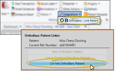 Open a patient folder in Edge Cloud, then from the Integrations drop down list in the Patient ribbon bar, select the OrthoBanc - Link Patient option. Then click Un-link OrthoBanc Patient. After confirming your action, the patient will no longer be able to be credited with OrthoBanc deposits.
