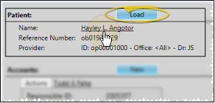 If you opened the OrthoBanc Accounts window from a patient folder, you will see the patient's name, OrthoBanc reference number, and provider ID in the Patient section of the window. If you opened the window from the Home ribbon bar, you can use the Load button to choose a patient who has already been linked with OrthoBanc. Once a patient is loaded, you can click the patient name link to open the Edge Cloud patient folder.