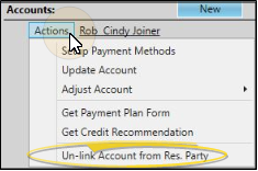 If an OrthoBanc account was linked to the wrong responsible party, you can use the Actions menu to remove the link. Click the Actions for the account you want to work with, and select the Unlink Account from Res. Party option. This will unlink the OrthoBanc account from the Edge Cloud responsible party record, and place it back in the Unlinked Accounts section of the window. You will need to manually link the account to the correct responsible party before any OrthoBanc deposits will be credited to the patient.