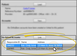 If the patient's responsible party has existing accounts in OrthoBanc that are not linked to an Edge Cloud contract, they will be listed in the Unlinked Accounts section of the window. To link the patient, select the desired account and click Link. The account will then be listed in the Accounts section of the window,