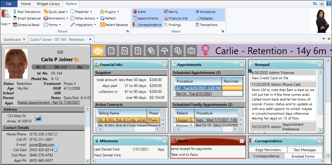 You can open the patient's OrthoBanc account from the Patient Information panel, the patient folder Finance page, or the Integration drop down list from the Tasks section of the Home ribbon bar. If a patient or contract does not display an OrthoBanc icon, it is not currently linked to an OrthoBanc account.