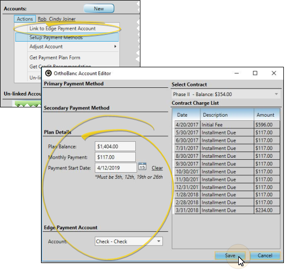Use the Link to Edge Payment Account action to open the OrthoBanc Account Editor window. Enter the balance you wish OrthoBanc to collect, the monthly payment amount, and the payment start date (the date must be the 5th, 12th, 19th, or 26th of the month). Then,select the Edge Cloud payment account to use for the deposits. The contract, contract details, and payment methods appear for your reference only, and cannot be changed here. Once you click Save, you will be able to see the plan details by clicking the OB Account tab at the bottom of the account, in the Accounts section of the window.