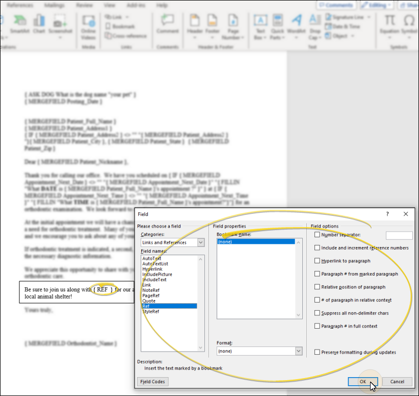 Position your cursor at the space after the REF, but inside the braces, and type your bookmark name. Do not enclose the bookmark in quotation marks. You may repeat this process to insert the REF code anywhere within the document, just as you would insert regular mail merge variables. You may even use the REF code inside other ASK codes, and within IF statements to further personalize your documents.