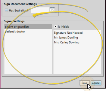 Save Signer Settings - After you have selected or skipped the signer for each signature / initials location in the document, click Save (or, click Cancel to start over). Once saved, the document is added to list of Edge Signature documents in progress. If you have assigned an email template to the document, the message is immediately sent to the patient, responsible party, or other appropriate party, prompting them to read and sign the document.