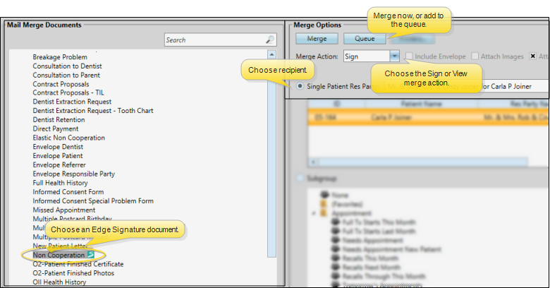 Open Mail Merge from the Reporting section of the Home ribbon bar and select an Edge Signature document. Then choose the recipient, and select either the Sign or View merge action. Then choose Merge to merge the document immediately, or Queue to add it to your queue.