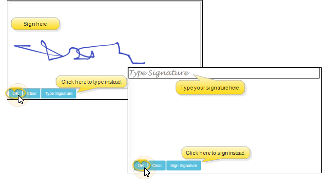 Depending on the type of device you are using, you may use your finger, a stylus, or another pointing device (such as a mouse) to sign the signature pad. If you prefer, you can click Type Signature, then type your signature or initials on your keyboard. You can toggle between signing and typing. When finished, click Ok at the bottom of the signature pad.
