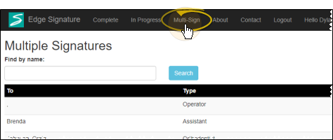 If you have multiple documents that need your signature or initials, you can choose to process all of them in one session. From the Edge Signature service window, open the Multi Sign tab and choose your name. Sign the document as described above. When you click Continue, the next document will appear for your signature. Continue until all the documents you need to sign are processed. If a document requires another signature, such as a second parent, it remains in the In Progress tab of the Edge Signature service.