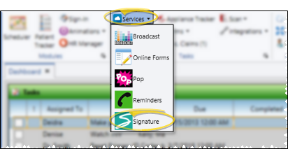 Home Ribbon Bar - Select Services from the Tasks section of the Home ribbon bar, and select Signature from the drop down options.