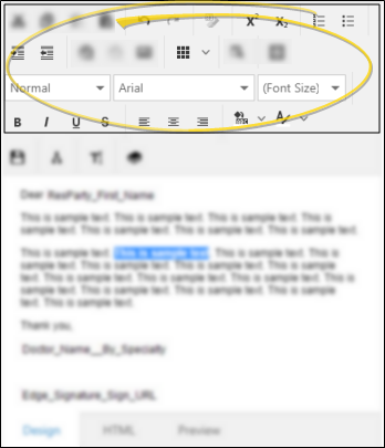 Use the icons at the top of the window to change the text properties and formatting, such as adding bold, italics, font, size, color, superscript, subscript, bullets, numbering, and tables just like a word processor. You can hover over an icon in the HTML editing window to see what each icon is used for.