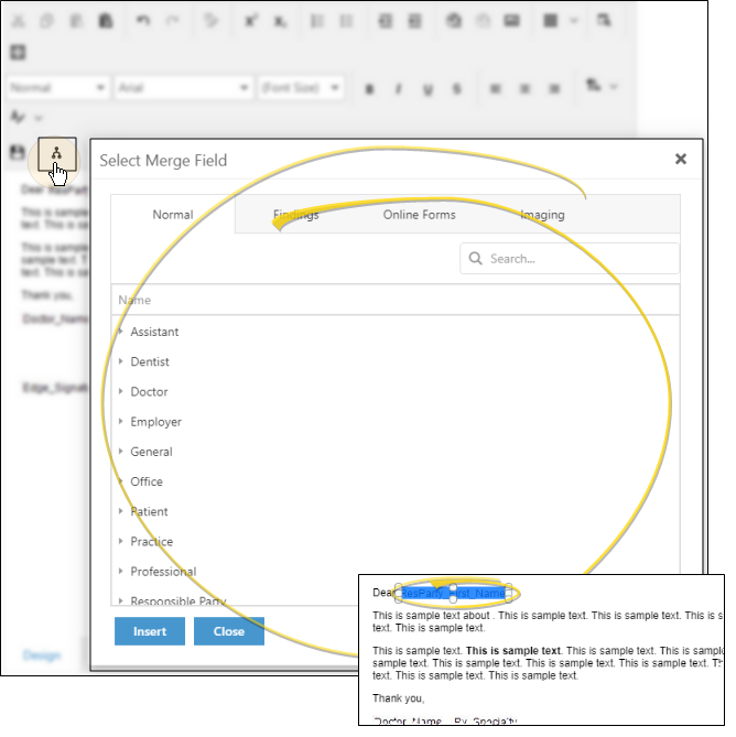 Place your cursor where you want to add a mail merge variable, then click the Insert Merge Fields icon from the toolbar and select the variable. Click Insert to add the variable to your document, and click Close to exit the merge field window. The variable will appear as an object in your document. You can drag, cut, copy and paste the object wherever needed. But, DO NOT EDIT the object or the variable will not work as intended. See "Mail Merge Variables" for details.