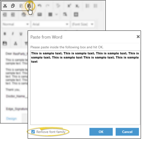 You can type your text, or use the icons on the toolbar, or use standard word processing shortcuts (i.e. Ctrl+C to copy and Ctrl+V to paste) to cut, copy, and paste text, including its properties, into your document. Alternately, you can use the Paste from Word icon to remove the text font before pasting.