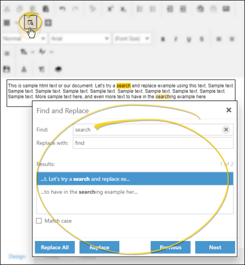 Use the Search icon to search for text anywhere in the current HTML editor window. You can optionally require exact case matching, and choose to replace one or more or more instances of your search results.