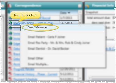 - Right-click a document in the patient correspondence history to send a message that includes links to both the patient folder, and the selected document. See "Patient Correspondence History" for details.