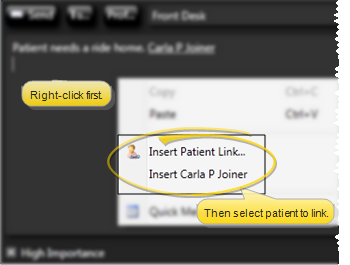 Link Patient Folder - Right-click where you would like to include a link to a patient folder, and select Link Patient. If a patient record is already active, that patient's information will be loaded automatically. Otherwise, you use Fast Find (either typing information or swiping a registered reward card) to search for the patient to work with. After you send the message, the recipient can click the link to open the patient folder. (The Send Message workflow activity automatically inserts a patient link at the top of the message. See "Workflow Editor" for details.) If you send a message with a patient link to a professional, the message is saved in both the professional and patient correspondence histories.