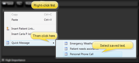 Add Quick Message - Right-click where you would like to insert text you have previously saved, and select the Quick Message option. Then select from your Quick Message list. (See "Messaging User Options" for details about creating and maintaining the list.)