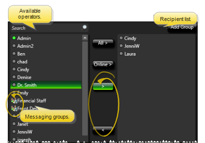 - Select employee and group names in the list at the left, then use the arrows to add and remove them from your recipient list, at the right of the window. Message group names are preceded by a special icon. You can hover over a group name in either the available staff or recipient list to see the individual staff members that are included in the group. When you send the message, each staff member that is included in selected groups will receive the message. (See more about message groups below.)