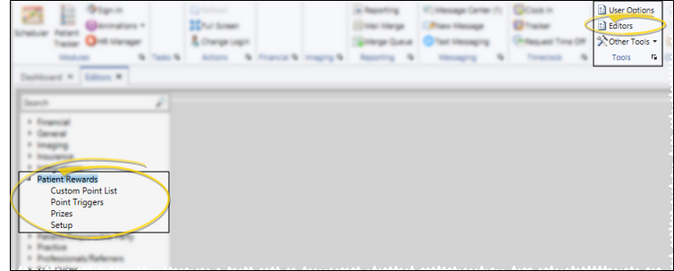 Select Editors from the Tools section of the Home ribbon bar. Then, from the Patient Rewards section, open the Prizes editor. (You can also use the Search field to look for the editor you want to work with.)