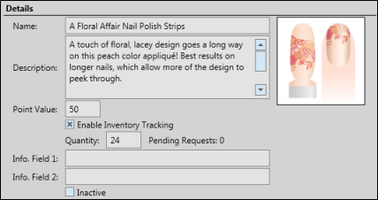 Info. Fields - Use the two internal Info. Fields to track additional information about the prize, such as where you purchase the items, or how much they cost. This information does not appear on the Prize Selector.