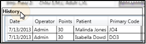 The History portion of the Prizes editor shows you a summary of when each prize type was redeemed. The history includes the date the prize was redeemed, the operator that processed the redemption, the number of points used, and name and ID code of the patient that earned the prize. You can view a more detailed history in the Patient Rewards Prize Tracking window.
