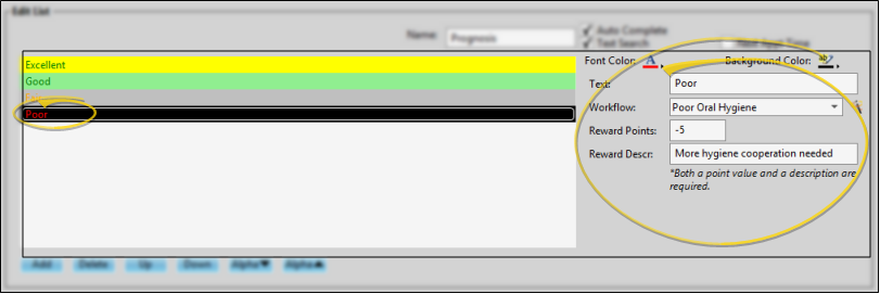 Use the Patient Reward fields of your Treatment Chart List editor to add or deduct Patient Reward points for specific responses. For example, you might create an Oral Hygiene list where you award 5 points for the response "Excellent" and deduct 5 points for the response "Poor". Then assign the list to a column in one or more Treatment Chart styles. When you create a treatment chart record with that style, and a response is selected for that column, the appropriate points will be added / deducted from the patient's total. Both you and the patient will be able to see the reward description.