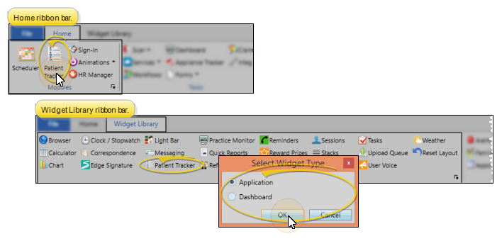 You can open the Patient Tracker application from the Modules section of your Home ribbon bar, or open the Patient Tracker widget from the Widget Library ribbon bar. In addition, you can open the Patient Tracker application without opening Edge Cloud by searching for the "Patient Tracker" app from your Windows Start menu. If you open the application in this manner, you might want to add a shortcut to your desktop or App page to make it easier to open the next time.