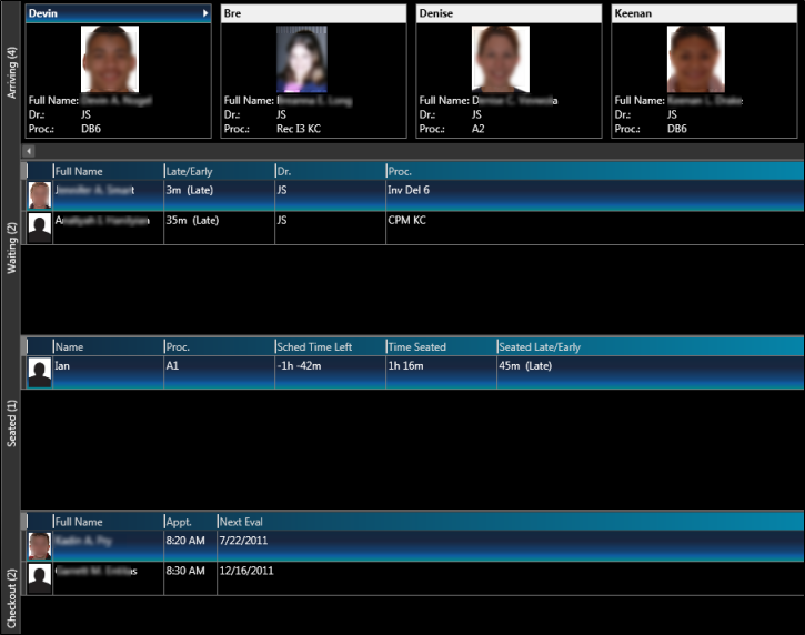 - The Patient Tracker is divided into several sections: Arriving, Waiting, Seated, and Checkout so you can tell at a glance the overall appointment flow in your office. You can use your Patient Tracker user options to select which sections to display on your computer screen.