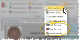 Patient Folder Barcodes - Select Other Actions from the Patient ribbon bar, and select a barcode action, described below. (An Edge Cloud patient folder must be open for the Patient ribbon bar to be available.)