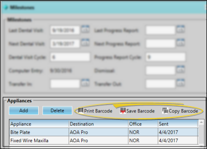 Appliance Barcodes - Open the patient folder Home page and enable the Milestones panel. Expand the panel to access the barcode actions. See "Patient Appliances" for details.
