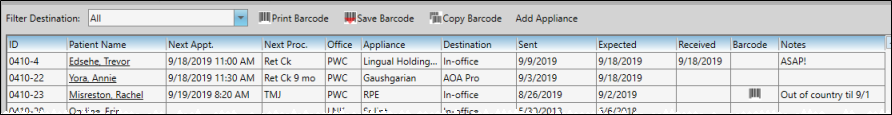 The Appliance Tracker lists patient appliances you have sent to lab destinations but have not yet been returned. Use this feature to review and edit expected appliance information.