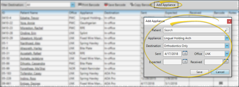 Click Add Appliance at the top of the Appliance Tracker window, then enter the details, including the patient, appliance type, destination, and related dates. When finished, click Save to add the appliance to the Appliance Tracker and the Milestones panel of the patient folder.