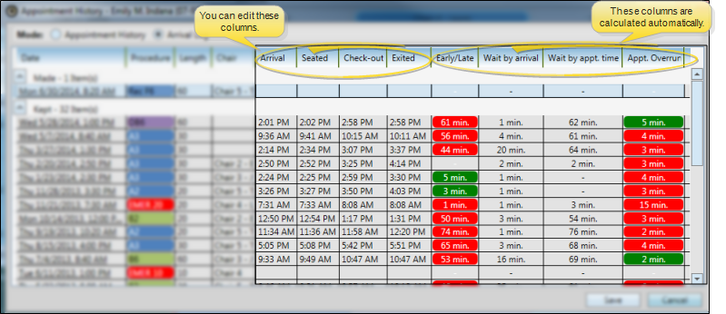 Click the column you want to change, and enter the time of day the patient arrived, was seated, placed in check-out or exited the operatory. The remaining columns are calculated automatically, and cannot be edited by you.