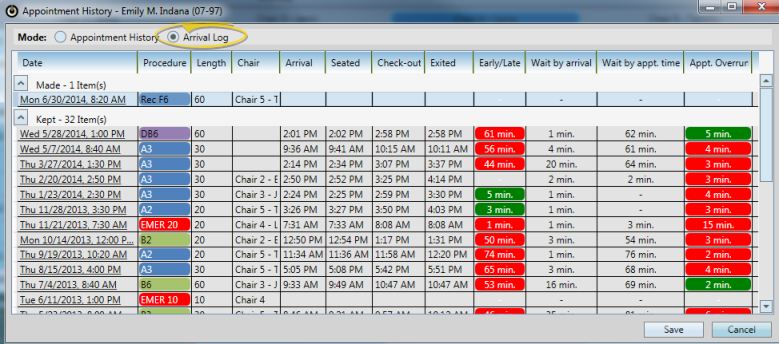 View Arrival Log For a Specific Date - You can view the list of arrival details for all patients on any given date by viewing the Arrival Log option of your Scheduler's List View mode. See "View Detailed Appointment List" for details.