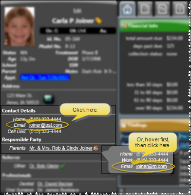 Patient Information Panel - Click the patient email address, or hover over a responsible party name. When the contact information pops up, you can click on that email address as well. (See "Patient Information Panel" for details.)