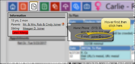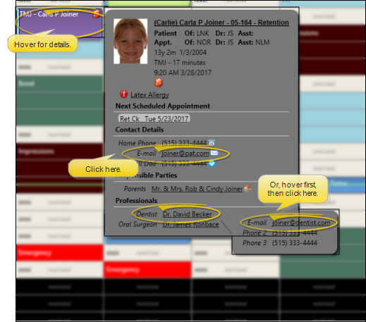 Scheduler - Hover over an appointment to pop up the contact information. You can then click the patient's email address, or hover over a responsible party or professional name to pop up that contact's information. Then select the email address. (See "Your Scheduler" for details.)