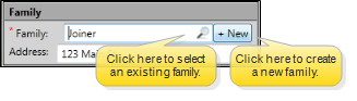 Create a New Family - Click +New, then confirm the family name and address, which default to the patient's last name and street address.