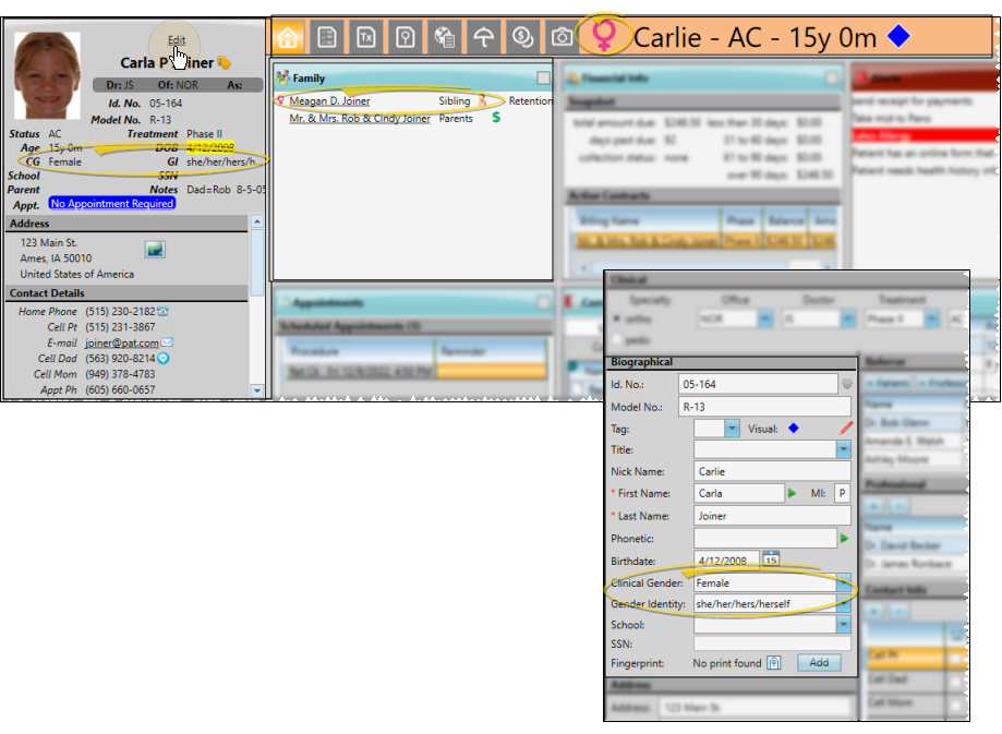 Clinical Gender / Gender Identity - As you create a patient folder or edit the Patient Information Panel, you can assign both the patient's clinical gender and gender identity preference. You use the Gender Identity editor to maintain the list of gender pronouns and associated icons needed for your practice. The abbreviations "CG" (clinical gender) and "GI" (gender identity) appear on the Patient Information panel of the patient folder. You can optionally use your Visual User Options to show / hide the gender identity icon in the patient folder header. In addition, the gender identity icon appears with sibling names in the Family panel of the patient's Home page.