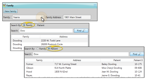 - When you are assigning a new patient to a family, or reassigning an existing patient to a family, you can search for either the family or patient name, to help you determine the correct family association.