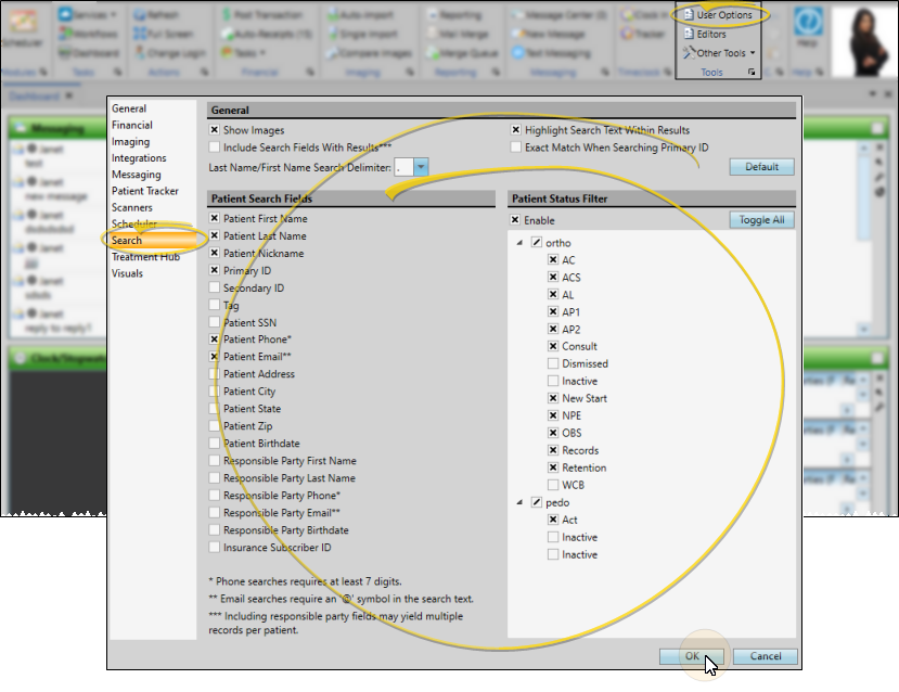 Set Up Search Options - Use the Search tab of your User Options window to select the data fields and patient statuses to use when Fast Find searches for patient folders and other records. You can also use the Search options to choose how to display the resulting records list. You may change the settings at any time without affecting any other user.See "Search Options" for details.