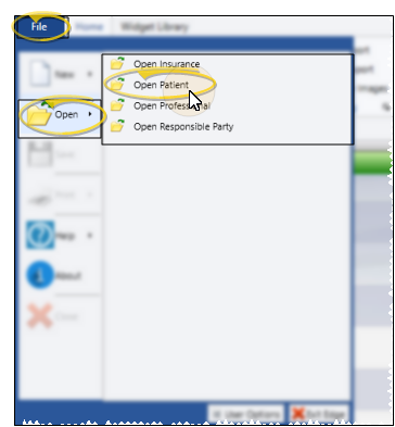 File Ribbon Bar - Select Open, then choose Open Patient from the File ribbon bar (or, choose a different type of record to open).