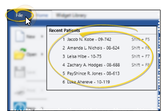 - Select the File ribbon bar, then select from the most recently accessed patient folders. Or, press Shift+F5 - F8 keys to open recent patient folders.