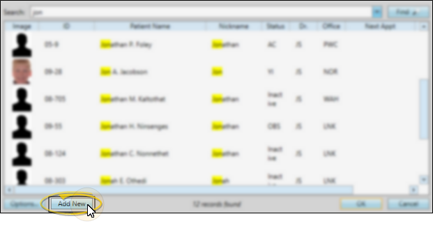 Create a New Patient Folder - If Fast Find does not find the patient you are searching for, you can click Add New at the bottom of the Fast Find window to open the New Patient window and create the folder. See "Create a New Patient Folder " for details.