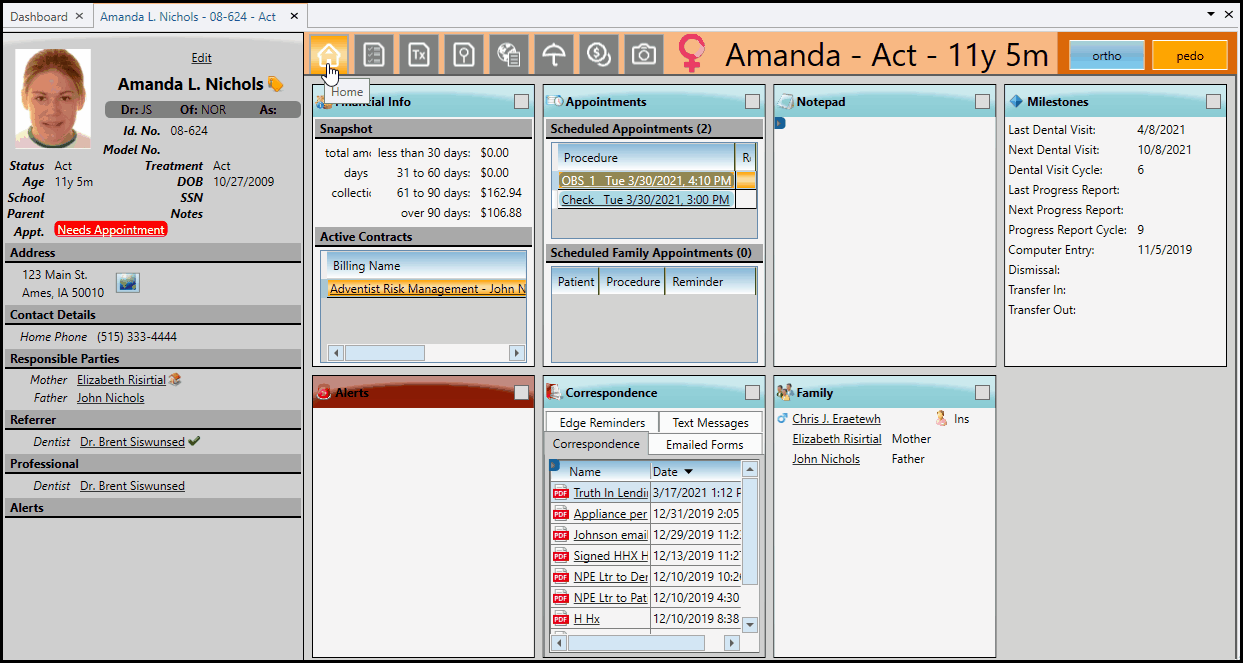 The information below is specific to your pediatric dentistry insurance records. From this page you can review the dental insurance plan(s) assigned to the responsible party, view and manage claims, and view and manage dental procedures that have been applied to the patient.