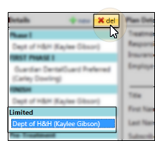 If you create an insurance record in error, you can remove it by clicking Del at the top of the records list. For an insurance record to be available for removal, no charges or receipts can ever have been posted to it, and no electronic submissions can ever have been submitted against the record. When you delete the insurance record, any associated contract is deleted also. Note that the Del option is available only when you have selected an insurance record that is available for removal.