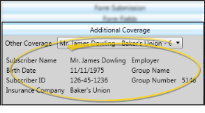 - Click the Additional Coverage bar to identify the patient's other insurance coverage, if any. The Other Coverage drop down list automatically enters the names of the other insurance records that are assigned to the same contract as the insurance record you are working on.