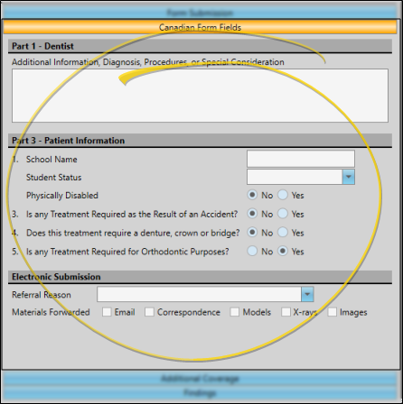 - (Available only if your default insurance form is a Canadian format.) Click the Canadian Form Fields bar to view and change the Dentist Only text, patient information details, and the information required to submit a claim for orthodontic services.