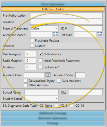 - (Not available if your default insurance form is a Canadian format.) Click the ADA Form Fields bar to view and change the additional fields required to submit a claim for orthodontic services.