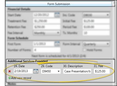 Add new service - Click Add new record to add a new record of service. You then enter the date of service, insurance code (CDT/ADA code from your Insurance Codes editor), and fee. The description is entered automatically, according to the code you supply, but you can edit it if needed.