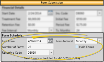 Schedule forms - (Required for generating Scheduled insurance forms) Use the First Form date, Form Interval, and Number of Forms fields to schedule regular continuation of treatment forms for this insurance plan.